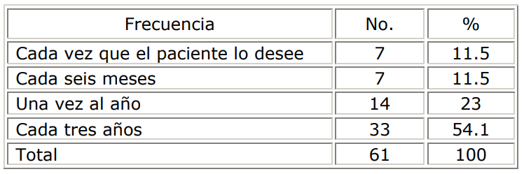 La Tabla 4 refleja que el 33% de las señoras estudiadas tenía conocimiento de cómo era la frecuencia adecuada de la realización de la citología, existiendo desconocimiento del resto de las pacientes sobre la frecuencia de la prueba.