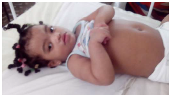 Por los antecedentes antes expuestos y el marcado retardo del desarrollo psicomotor, la paciente fue remitida a la consulta de Neurología a los tres meses de edad donde se evidenció en el examen físico las dismorfias cráneo-faciales: desviación de las hendiduras palpebrales, puente nasal deprimido, filtro corto, labio superior fino, implantación baja de las orejas, micropnatia, protrusión de la lengua, frente prominente, implantación baja del cabello y en extremidades acortamiento de la falange distal del quinto dedo de ambas manos, creodactilia del quinto dedo de los pies, además, de fosa sacra y pliegue sacro errante acompañado de hipotonía severa. Asociado con alteraciones cardíacas de tipo comunicación interauricular (Figura 1).