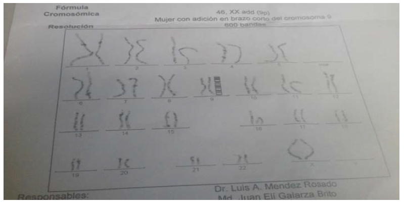 Se analiza en la consulta multidisciplinaria de genética, decidiéndose indicar el cariotipo de amplio espectro y seguimiento cada tres meses para evaluar el desarrollo psicomotor obteniendo el siguiente resultado: