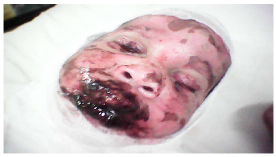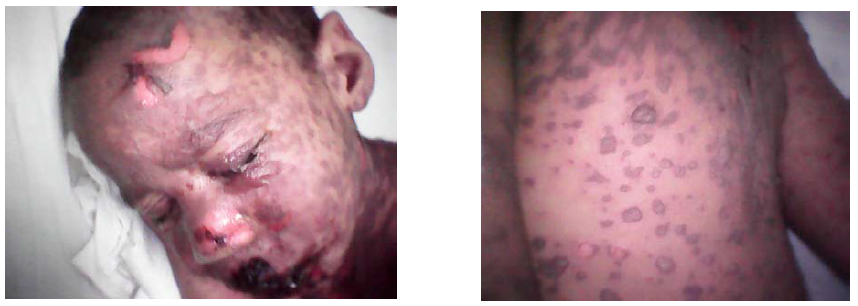 Al examen físico se encontró la piel con rash acompañado de lesiones eritemopapulosas en toda la economía corporal, con descamación de piel facial y signo de Nikolsky el signo consiste en presionar la piel suavemente para provocar la separación de las capas de piel epidermis de la dermis (Figuras 1 y 2).