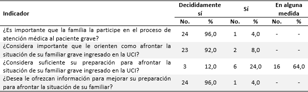 El objetivo de los cuidados al paciente grave es brindar atención de médica y de enfermería oportuna y eficiente a toda persona con una alteración en la función de uno o varios órganos, que pone en riesgo la vida y puede determinar la muerte, los que se identifican como pacientes críticos.1,2) Estos requieren la exposición a procederes diagnósticos y terapéuticos, que generan un estado de ansiedad y produce inestabilidad emocional y de ambiente social a los familiares, en los que se observan manifestaciones de preocupación, incertidumbre, irritabilidad, culpa, frustración, depresión y ansiedad, que se traducen en un constante deseo de información que les hace formular muchas preguntas sobre el resultado y pronóstico de salud de su paciente.3,4
