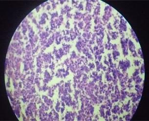 Se realizó biopsia por aspiración con aguja fina (BAAF) del nódulo de mama (No. 43) que informó: en el área de punción se extraen 2 ml de líquido serohemático. Citológicamente se observó fondo serohemático con infiltrado inflamatorio crónico agudizado, células mioepiteliales en sábanas sueltas de características normales. Compatible con fibroadenoma con degeneración quística. Se realizó exéresis y biopsia del nódulo (Figura 1), que informó: infiltración maligna de la mama por LNH, variedad linfoblástica de alto grado de malignidad.