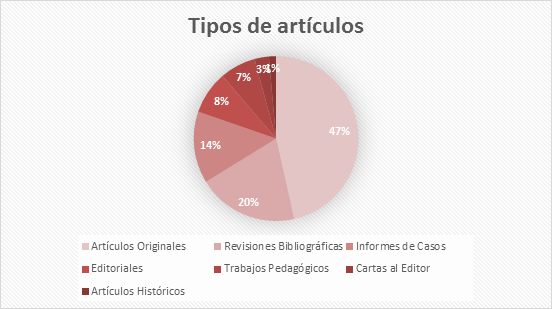 Fueron publicados un total de 71 artículos; figurando 12 artículos en cada uno de los números regulares, con excepción del Número 4 que tuvo 11. De dicho total: 6, fueron Editoriales; 2, Cartas al editor; 33 se encontraron como Artículos originales; 5, Trabajos pedagógicos; 10 enviados como Informes de casos; 14 fueron Revisiones bibliográficas y 1 correspondió a la sección de Artículos históricos (Figura 1). Los artículos originales, incluidos los de corte pedagógico como refieren las Políticas de sección, constituyeron el 53,5 % del total.