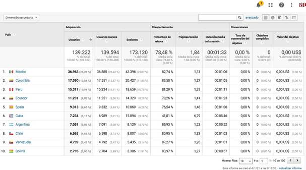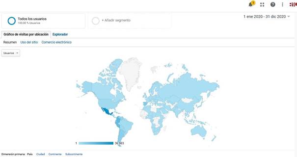 RIC recibió 139 222 visitas de alrededor de 129 países el pasado 2020 (Figura 2 y Figura 3). El mes que recibió más visitas fue el de octubre con 33 517 visitas (24,07 %). Cuba ocupó el puesto número seis, como reflejan los datos, con el 5,17 % de las visitas efectuadas, antecedido por México, Colombia, Perú, Ecuador y España.