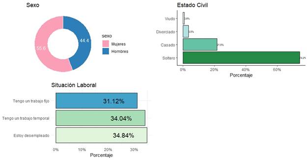 El estudio estuvo conformado por 209 mujeres (55,6 %) y 167 hombres (44,4 %). El rango de edad se ubicó entre 18 a 64 años, la edad promedio fue de 29 años y se presentó una desviación estándar de 9,69. Se indagó sobre características demográficas de los participantes y se encontró que, respecto al estado civil, la mayoría era soltero (74,2 %) y casado (21,5 %), aunque también se identificó a divorciados (3,5 %) y viudos (0,8 %). Asimismo, en relación a la situación laboral, el 34,84 % se encontraba desempleado, el 34,04 % indicó que tenía un trabajo temporal y el 31,12 % tenía un trabajo fijo (Figura 1).