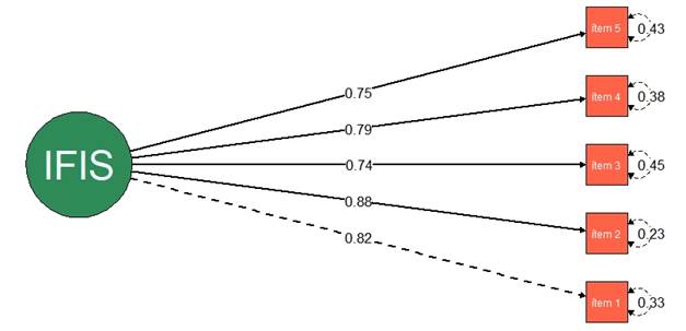 Respecto a la invarianza de medición, el ajuste fue similar en todas las restricciones (configural, métrica y fuerte). Estos resultados sugieren que las propiedades psicométricas del IFIS son iguales para los grupos de sexo y edad. En ese sentido, existe una justificación empírica para que estudios posteriores consideren establecer diferencias entre aquellos grupos. Este hallazgo concuerda con los resultados de un estudio realizado en España11, que también analizó la invarianza de medición para el sexo y edad con índices de ajuste satisfactorios. Por lo tanto, el IFIS presenta adecuadas propiedades psicométricas de medición y es consistente con los resultados de investigaciones previas, lo que refuerza aún su replicabilidad y validez.
