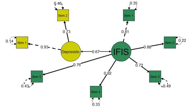 Por último, respecto a la evidencia basada en relación a otras variables, el modelo SEM basado en el IFIS y depresión, presentó un buen ajuste: CFI=0,99, RMSEA=0,04 [IC del 90 %: 0,00-0,068], SRMR=0,04, WRMR=0,52. Por lo tanto, las puntuaciones obtenidas mediante el IFIS y la depresión (r=0,67; p=0,001), se correlacionaron de manera positiva y estadísticamente significativa, con un tamaño del efecto fuerte (Figura 3).