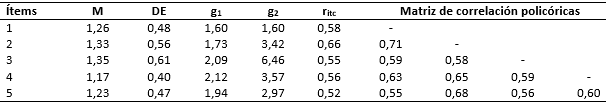 En la tabla 1 se evidencia los análisis descriptivos de los ítems. La media se ubicó entre 1,17 (ítem 4) y 1,35 (ítem 3), mientras que la desviación estándar se encontró entre 0,40 y 0,61. La asimetría y curtosis presentaron valores superiores a 2,00, a excepción del ítem 1. Por otro lado, la correlación corregida ítem test fue superior a 0,20, siendo el ítem 2 el que mayor discrimina. Mientras que la matriz de correlación policóricas demostró que no hubo presencia de multicolinealidad, es decir, intercorrelaciones mayores a 0,90.