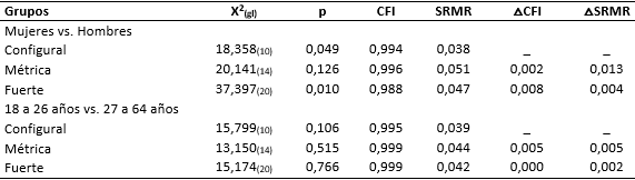 El análisis de invarianza factorial se presenta en la tabla 2. Para ambos grupos (sexo y edad) se evidenció que la variación entre cada restricción fue mínima para el índice de ajuste comparativo (ΔCFI<0,010) y la raíz estandarizada media cuadrática (ΔSRMR<0,030). Dado que se cumplió la invarianza fuerte en ambos grupos, se procedió a comparar las medias latentes. En relación al sexo, se encontró diferencias estadísticamente significativas (t(gl)=3,42(374); p=0,001), siendo esta diferencia a favor de las mujeres (M=6,63) en comparación con los hombres (M=5,98). Mientras que en el grupo de edad también se encontraron diferencias estadísticamente significativas (t(gl)=2,93(374); p=0,003), siendo esta diferencia a favor del grupo de 18 a 26 años (M=6,63) comparado con el grupo de 27 a 64 años (M=6,10).