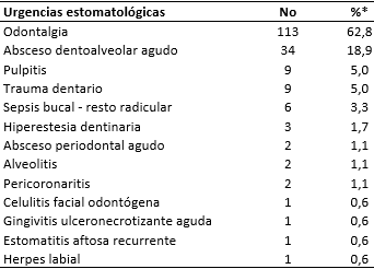 Las odontalgias y los abscesos dentoalveolares agudos fueron las afecciones estomatológicas predominantes con 113 (62,8 %) y 34 casos (18,9 %); respectivamente, según tabla 1.