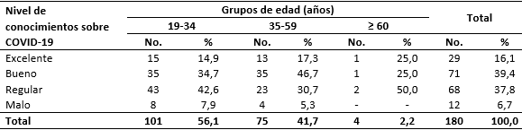 En los grupos de 19-34 y ≥ 60 años predominaron los conocimientos de Regular con 42,6 y 50,0 %; respectivamente, mientras que en el grupo de 35-59 años fue de Bueno para un 46,7 %. Esta asociación resultó estadísticamente no significativa.