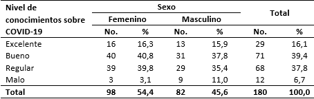 Método: Se realizó un estudio descriptivo transversal entre marzo y junio de 2020, con un universo de 180 pacientes seleccionados mediante un muestreo probabilístico aleatorio simple, de ambos sexos y mayores de 18 años, que dieron su consentimiento para participar en la investigación. Se excluyeron aquellos con síndrome respiratorio agudo evidente. Se evaluaron la edad, sexo, urgencias estomatológicas y nivel de conocimientos. Se empleó la prueba Chi-cuadrado, con un grado de significación α=0,05, para determinar la asociación entre nivel de conocimientos, la edad y el sexo.