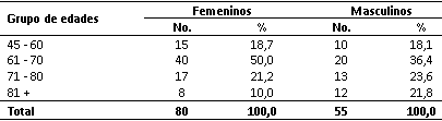 La tabla 1 muestra la distribución de pacientes según edad y sexo, donde predominó el grupo de diabéticos de 61-70 años de edad del sexo femenino con un 50 % del total.