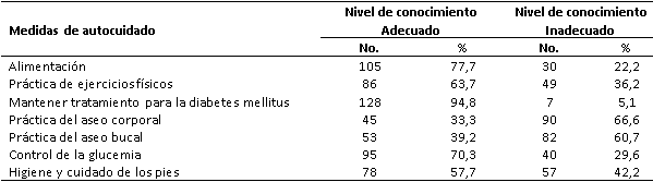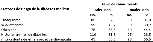 Resultados: Los resultados agrupados en forma de tablas mostraron un predominio de los pacientes del sexo femenino con diabetes mellitus tipo 2 de 60-70 años. El inadecuado nivel de conocimientos de los factores de riesgo más sobresaliente fue el antecedente de la enfermedad cardiovascular. Las medidas de autocuidado más conocida fue mantener el tratamiento para la diabetes mellitus.