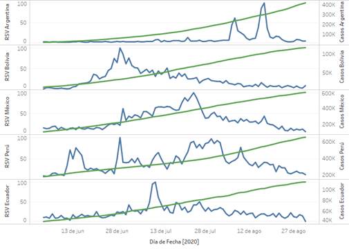 Se evaluaron 90 días de volúmenes de búsqueda (Figura 1). Se pudo demostrar que en Argentina el nivel de búsqueda del término en estudio y la evolución del número de casos por COVID-19 en ese país presentó una correlación positiva alta (r: 0,78); en el caso de Perú (r: 0,14), Ecuador (r: 0,15) y México (r: 0,10), tanto los niveles de búsqueda y los casos presentaron una correlación positiva baja. Por el contrario, la correlación en Bolivia fue negativa (r: -0,18).