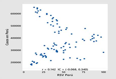 En el caso específico de Perú, se pueden observar su comportamiento más detallado con los casos, con un IC de 95 % para la correlación de Spearman, en la Figura 2.