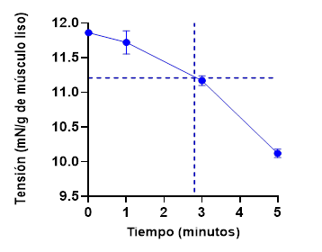 Como se destaca, el medicamento produjo una disminución apreciable del tono muscular, con una diferencia al minuto cinco de 1,74 mN con respecto a la tensión base inicial y 1,09 mN con respecto a la media general de 11,21 ± 0,07 mN/g de músculo (línea azul discontinua horizontal). Las cifras de tensión se situaron por debajo de esta última a partir de los 2 minutos con 50 segundos aproximadamente (línea azul discontinua vertical).