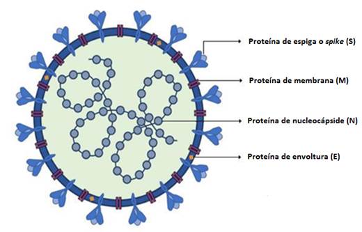 Los genes más importantes son estructurales: S (de spike o pico o espiga o espícula), E (envoltura), M (membrana) y N (nucleocápside).5,12) Como si fuese un erizo marino tiene muchas espinas (proteína espicular) que salen de su cuerpo; cada espina está formada por tres subunidades u homotrímero de dicha proteína espicular. El genoma viral codifica también, al menos, 16 proteínas no estructurales.13 En la Figura 1 aparece una representación esquemática del coronavirus.