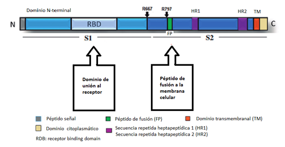 En la subunidad S1 hay un dominio N-terminal (14-305 residuos) y un dominio de unión al receptor (RBD, por sus siglas en inglés, receptor-binding domain, 319-541 residuos).21 La subunidad S2 comprende: el péptido de fusión (FP) (788-806 residuos), la secuencia repetida heptapeptídica 1 (HR1) (912-984 residuos), HR2 (1163-1213 residuos), el dominio transmembranal o TM (del inglés transmembrane, 1213-1237 residuos) anclado en la membrana viral y el dominio citoplasmático (1237-1273 residuos).