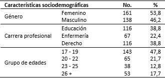 Hubo predominio del género femenino (53,8 %). La distribución de los estudiantes universitarios de acuerdo a la carrera profesional estudiada se comportó con el 38,8 % de la carrera de Educación y Derecho y Ciencias Políticas, respectivamente, mientras que el 22,4 % perteneció a la de Enfermería. Se encontró que el 47,8 % de la muestra correspondió a estudiantes cuya edad estuvo entre 17 a 19 años, como se muestra en la tabla 1.