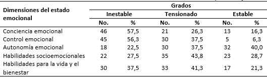 En cuanto al estado emocional (Tabla 2), en las dimensiones conciencia emocional y control emocional predominó el estado de inestabilidad con el 57,5 % y el 56,3 %, respectivamente; en la autonomía emocional la mayor incidencia fue en la estabilidad (40 %); mientras que en las habilidades socioemocionales y habilidades para la vida y el bienestar los mayores porcentajes fueron obtenidos en estado de tensión, con el 43,8 % y el 41,3 %, para cada uno de estas.