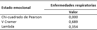 Se estableció el nivel de asociación entre las variables estado emocional y enfermedades respiratorias, con la utilización de la prueba Chi-cuadrado, por ser una variable nominal y otra ordinal; para la identificación de la intensidad de asociación entre ambas variables se aplicó la prueba simétrica V Cramer y para la identificación de la direccionalidad, la prueba Lambda.
