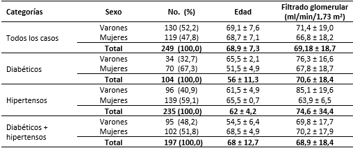 Methods: A descriptive, retrospective study was carried out in 2020 to determine the renal function in 249 older adults with diabetic and hypertension problems, attended at the Family Doctor's Office No. 4, Policlínico Docente "Ángel Alfonso Ortiz Vázquez", Manzanillo, Granma. The Cockcroft-Gaulty formula was used. The following variables extracted from the medical records were used: diagnosis of diabetes mellitus, diagnosis of hypertension, age, sex, weight and creatinine text.