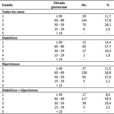 La tabla 2 muestra el grado de lesión renal en pacientes diabéticos y/o hipertensos. Solo 29 pacientes (11,6 %), tenían un FG normal por encima de 90 ml/min/1,73 m2. El porcentaje más numeroso, 144 pacientes (57,8 %), se sitúo en el intervalo 60 a 89 ml/min/1,73 m2; entre 30 y 59 ml/min/1,73 m2, 70 pacientes (28,1 %), mientras que 6 pacientes (2,4 %) tuvieron un resultado inferior a 30 ml/min/1,73 m2.