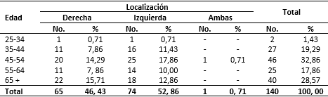 En estudios realizados en Latinoamérica21, se encontró predominio de la mama izquierda, sin embargo, en este estudio existió variabilidad con respecto a la mama afectada, encontrándose indistintamente afectación de la mama izquierda como de la mama derecha, coincidiendo con otros trabajos realizados en la provincia.22,23 En la literatura no hay evidencias concluyentes de que exista predominio de un lado en particular al ser afectado por el cáncer.24