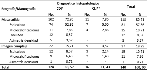 En la tabla 3 se correlacionan los dos diagnósticos imagenológicos (ecografía y mamografía) con el diagnóstico histológico. El mayor porcentaje de las pacientes (74, 53 %) presentó una lesión de aspecto espiculado en la mamografía, de aspecto sólido en la ecografía y correspondiente a un carcinoma ductal infiltrante por la histología. Los dos subgrupos siguientes, ambos de 12 casos (9 %): en uno de los grupos se encontraron las lesiones de aspecto espiculado en la mamografía y complejas por ecografía y por histología fue un carcinoma ductal; el otro grupo fueron lesiones lobuladas por mamografía, complejas por ecografía y por histología un carcinoma ductal.