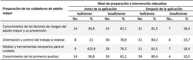 La mayoría de los cuidadores del adulto mayor, incluidos en el estudio antes de la intervención educativa, demostraron insuficiente nivel de preparación con respecto a los factores de riesgos del adulto mayor y su prevención, orientación y control del trabajo a realizar, medios y herramientas necesarias para el cuidado y conocimiento de los primeros auxilios. Después de la intervención educativa disminuyeron las carencias teóricas-prácticas de los cuidadores con respecto al tema y se incrementó su preparación a través de los conocimientos adquiridos.
