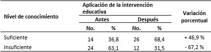 La tabla 2 expresa que antes de la ejecución de la intervención educativa, el 63,1 % de los cuidadores manifestaron un nivel de conocimientos insuficiente, proporción que disminuyó al 31,5 % luego de aplicarla, lo que significó una reducción en un 67,2 % de los cuidadores con insuficientes conocimientos teórico-prácticos respecto al tema. El 46,9 % incrementó su conocimiento (p<0,05), lo que indicó la ventaja de implementar la intervención educativa que se diseñó.