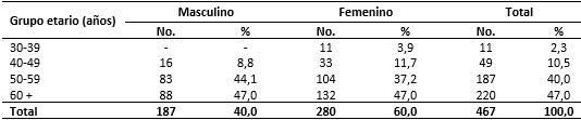 El 47,0 % eran ancianos y el 60,0 % lo constituyeron mujeres. El promedio de edad de la muestra fue 60 años, siendo esta superior entre los hombres (Tabla 1).