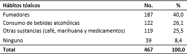 Los hábitos tóxicos en los pacientes estudiados se mantuvo un mayor por ciento (40 %) en fumadores, seguidos por los consumidores de bebidas alcohólicas (26 %) y de otras sustancias (25 %), que evidenció un ínfimo porcentaje a los no consumidores, como se expresa en la tabla 2.