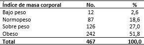 Al evaluar el índice de masa corporal se evidenció el predominio de pacientes hipertensos obesos (242) lo que representó el mayor por ciento (51,8 %) constituyendo la mitad de los mismos y, a ellos, les continuaron los pacientes con sobrepeso (126) representando un 27,0 % (Tabla 3).
