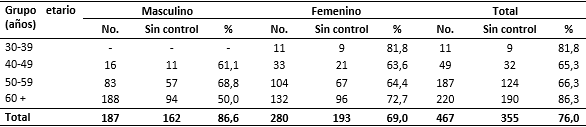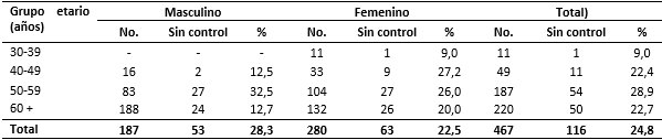 Como se observa en la tabla 5 y tabla 6, se produjo una disminución de pacientes sin control de la hipertensión, de un 76 % a inicios de la intervención, a un 24,8 % en el corte final de la misma.