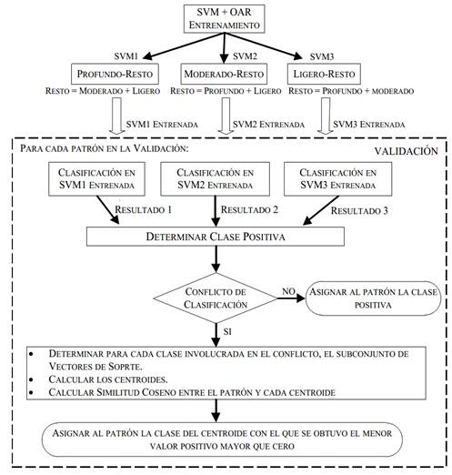 Sin embargo, con el algoritmo OAR se presentan los siguientes conflictos de clasificación en la toma de decisiones: un patrón puede ser clasificado en más de una clase positiva o para todas las SVM implementadas el patrón puede ser reconocido en la clase negativa. Para corregir este problema y teniendo en cuenta que, en el reconocimiento de patrones, el análisis de la distancia entre dos vectores es una medida de similitud (mientras más pequeña sea la distancia, mayor será su parecido), se evaluó la similitud entre el patrón a clasificar y los centroides de un subconjunto de los vectores de soporte de las clases implicadas en el conflicto de clasificación, aplicando como medida de semejanza entre dos vectores a la métrica Similitud Coseno. Estos subconjuntos se eligieron de igual tamaño y se usaron los vectores de soporte debido a que ellos definen la frontera de decisión y el hiperplano óptimo de separación.