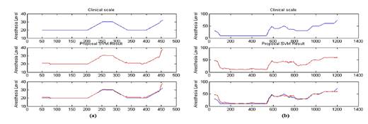 La figura 2 muestra la estimación de estados de sedación anestésica de dos pacientes usando SVM con algoritmo OAR y Similitud Coseno.
