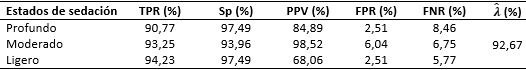 Es conveniente señalar que el 68,06 % de precisión obtenido para el estado de sedación ligero, estuvo condicionado a la diferencia en la cantidad de patrones de las clases en la matriz de confusión asociada (Tabla 1), vea cómo los falsos positivos detectados en el reconocimiento representaron solo el 2,51 % de las muestras. En el estado moderado, la sensibilidad resultó en un 93,25 %, para un 6,75 % de falsos negativos; los falsos positivos solo representaron un 6,04 % en este estado para una especificidad del 93,96 %. En la sedación profunda se alcanzó una sensibilidad de 90,77 % y se computó la especificidad en un 97,49 %, para una razón de falsos positivos y falsos negativos de 2,51 % y 8,46 %, respectivamente.