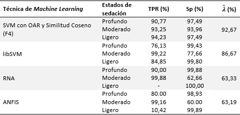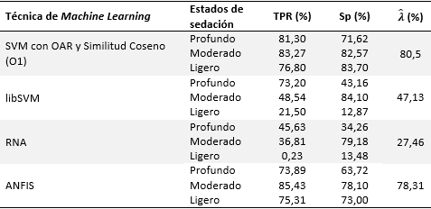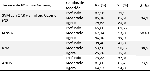 En los resultados obtenidos con libSVM, el reconocimiento del estado de sedación ligero fue adecuado con un TPR y Sp igual a 84,85 % y 99,8 %, respectivamente; sin embargo, la detección de los verdaderos positivos en la sedación profunda y de verdaderos negativos en moderado no alcanzó el 78 %, por consiguiente, aunque la exactitud fue de 86,67 %, los resultados obtenidos con libSVM no se consideraron correctos.
