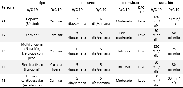 Respecto al tipo, cabe señalar que se sustituyó en la mayoría de los estudiados por otras actividades que requerían de menor esfuerzo físico o gasto energético (ejercicio cardiovascular/caminar). Referente a la frecuencia, con relación al número de días por semana de actividad física, se observó una variación en la misma (disminuyó, aumentó o se mantuvo). En cuanto a la intensidad, esta se redujo pasando de ejercicios de intenso-moderado a leve. Por último, con relación a la duración, disminuyó drásticamente respecto al tiempo destinado a la actividad, con un máximo de 150 minutos por día pre-COVID, hasta 20 minutos por día pos-COVID.