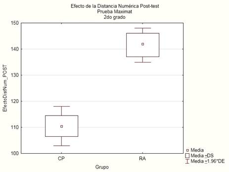 El grupo de niños de segundo grado que entrenó con el videojuego “Recuérdalo Todo” mostró resultados significativamente más altos en los pos-test en las tareas de rendimiento matemático siguientes: en la eficiencia del efecto de distancia numérica (t=-12,264; p= 0,000000) medida por la tarea de comparación de números del software Maximat.