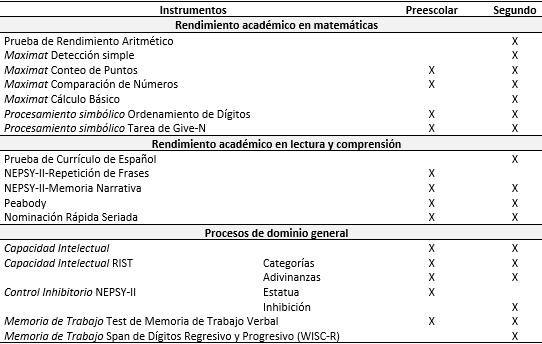 Se realizó una evaluación neuropsicológica de los principales procesos cognitivos. Se aplicaron instrumentos para evaluar en ambos grados, el rendimiento académico en matemáticas, el rendimiento académico en lectura y comprensión y los procesos de dominio general (ver archivos complementarios). La tabla 1 muestra las pruebas que fueron aplicadas en cada grado.