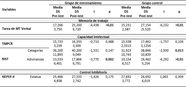 El grupo control correspondiente mostró resultados significativamente altos en los pos-test en las tareas de dominio general las mejorías significativas fueron en la tarea de memoria de trabajo verbal (t=-6,232; p=0,00004), la tarea de adivinanzas (t=-6,292; p=0,00004) y categorías (t=-2,93; p=0,012) de la prueba de capacidad intelectual RIST. La tabla 2 muestra estos resultados.