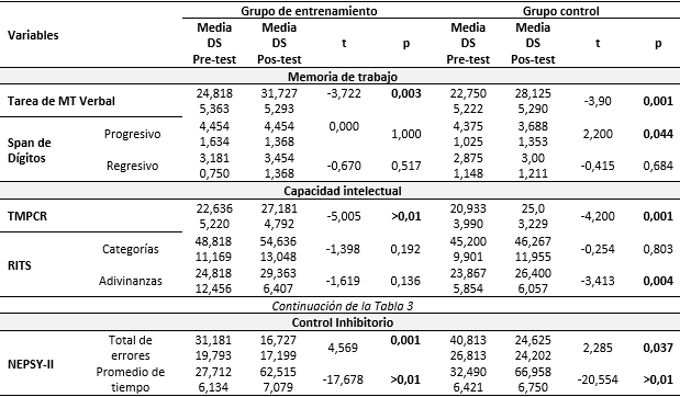 El grupo control correspondiente mostró resultados significativamente altos en los pos-test, en el span de dígitos progresivos (t=2,200; p=0,043), en la tarea de memoria de trabajo verbal (t=-3,900; p=0,001), en el test de matrices progresivas coloreadas de Raven (t=-4,019; p=0,001), en la tarea de adivinanzas (t=-3,412; p=0,004) de la prueba de capacidad intelectual RIST, en el tiempo total promedio (t=-20,553; p= 0,000000000002) y la cantidad de errores cometidos (t=2,284; p=0,037) en la prueba de Inhibición del NEPSY-II. La tabla 3 muestra estos resultados.
