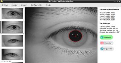 Las bases de datos públicas más utilizadas para el seguimiento ocular son la UBIRIS10 y la CASIA.11 Dichas bases de datos no poseen anotaciones del centro de la pupila que sirvan como referencia a la hora de aplicar métricas para evaluar el desempeño de los métodos. Actualmente, son muy escasas las herramientas interactivas que faciliten realizar una marcación (anotación) fiable del centro de la pupila y, en consecuencia, posibiliten el entrenamiento y la posterior validación de los algoritmos automatizados para estimar el centro de la pupila. El objetivo de este trabajo es desarrollar una herramienta de código abierto para anotar, de forma semiautomática e interactiva, el centro de la pupila por parte de un especialista.
