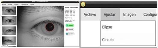 En Menú "Ajustar": se presentan dos algoritmos para realizar el ajuste de la pupila a una de dos formas geométricas, elipse o círculo. Para ambos casos, el usuario debe marcar 5 puntos (x, y) que se encuentren en el borde de la pupila, los cuales representan la entrada del algoritmo. Luego se realiza el ajuste por mínimos cuadrados. Si la opción seleccionada fue ajuste de elipse, los parámetros que serán notificados en el panel derecho de la aplicación serán: “Centro”, “Semieje Mayor”, “Semieje Menor”, “Ángulo de Rotación” (Figura 1). Si se escoge la opción de ajuste de círculo aparecerá en el panel derecho de la aplicación los parámetros “Centro” y “Radio”, devueltos por el algoritmo, como se muestra en la figura 3.