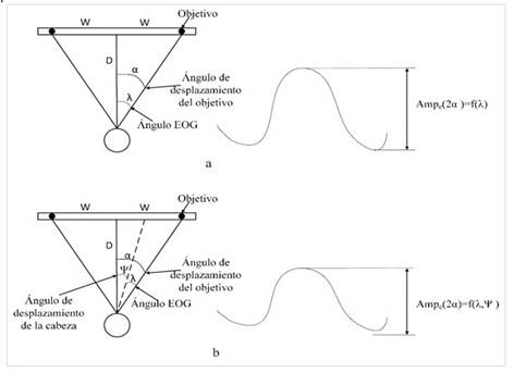 El análisis que se ha realizado en la figura 1 contempla el comportamiento de ambos ojos como uno solo, o sea, con el modelo de ojo cíclope, el cual es ampliamente utilizado.6,7,8) Según esta figura lo que se obtiene a la salida del amplificador de la señal EOG horizontal (entre los cantos de ambos ojos) es la señal de tensión en volts, la cual se puede expresar en grados (previo proceso de calibración) y es proporcional al ángulo de observación del paciente (±λ) a un estímulo visual de amplitud angular (±α). Idealmente, α=λ, y la amplitud EOG estimada (Ampe) es función solamente de λ (como se observa en la figura 1a. Si ocurren movimientos involuntarios de la cabeza entonces esta igualdad se ve alterada, provocando errores en la estimación de λ y, por tanto, en el diagnóstico. Cuando esto ocurre, generalmente el movimiento de la cabeza durante la realización de una prueba es en el mismo sentido que el del estímulo visual y el del movimiento ocular como se observa en la figura 1b, lo que provoca que α=λ+Ψ, donde Ψ es el ángulo que se desplazó la cabeza del paciente en el plano horizontal (paralelo al suelo).