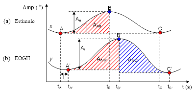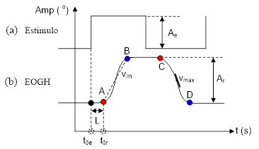 En la figura 2 se observan las señales de estímulo y respuesta electrooculográfica horizontal (EOGH) sacádica, sus puntos característicos y los principales parámetros diagnósticos que resultaron de relaciones entre ambas, cuando no hay movimiento de la cabeza.