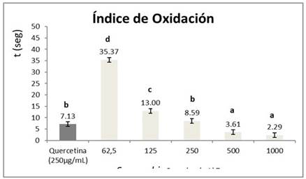 El índice de oxidación se calculó a través de la medición del tiempo en segundos en que los compuestos presentes en el extracto y/o el patrón tardaron en decolorar la solución de permanganato. Un tiempo menor es indicativo de una mayor capacidad reductora del extracto sobre la solución de permanganato. La Figura 1 muestra los resultados obtenidos para este ensayo, apreciándose como el extracto evaluado a la concentración de 250 µg/mL consigue decolorar la solución de permanganato en un período de tiempo estadísticamente igual al que lo hace la sustancia patrón quercetina a esa misma concentración.